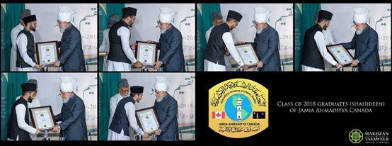 وخلال حفل التخرج، تم منح 17 خريجا من الجامعة الأحمدية في المملكة المتحدة و6 خريجين من الجامعة الأحمدية في كندا و18 خريجًا من الجامعة الأحمدية في ألمانيا "درجة شاهد" حيث قام حضرة ميرزا مسرور أحمد بتسليمهم شهادات التخرج ليلحقوا بالتالي بركب دعاة وأئمة الجماعة الإسلامية الأحمدية.
