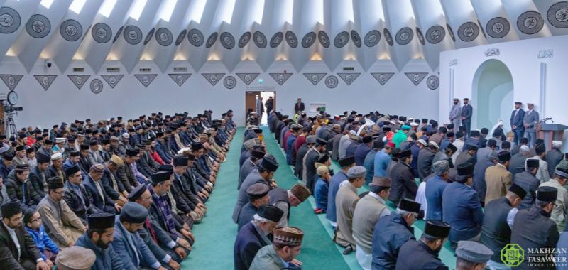 وقبل إلقاء خطبة الجمعة، أزاح حضرته الستار عن اللوحة التذكارية خارج المسجد، ثم أشار إلى أنه عندما افتتح سيدنا الخليفة الثاني (رضي الله عنه) المسجد المبارك في ربوة قال إنه يجب أن يكون هناك تنسيق لأداء ركعتي نافلة قبل الافتتاح، "ولكن هذا التنسيق لم يكن متاحا في هذا الوقت لذا سنؤدي سجدة الشكر لله تعالى" وذلك امتنانًا لما تفضل به علينا من هذا المقر والمسجد الجديد للجماعة الإسلامية الأحمدية. كان الحاضرون ممتلئين بالعواطف الجياشة أثناء سجدة الشكر، كما شاركهم تلك اللحظات الخاصة المسلمون الأحمديون في جميع أنحاء العالم وذلك عبر شاشات التلفاز.