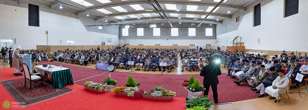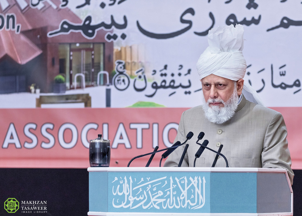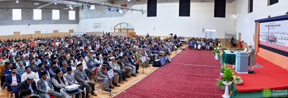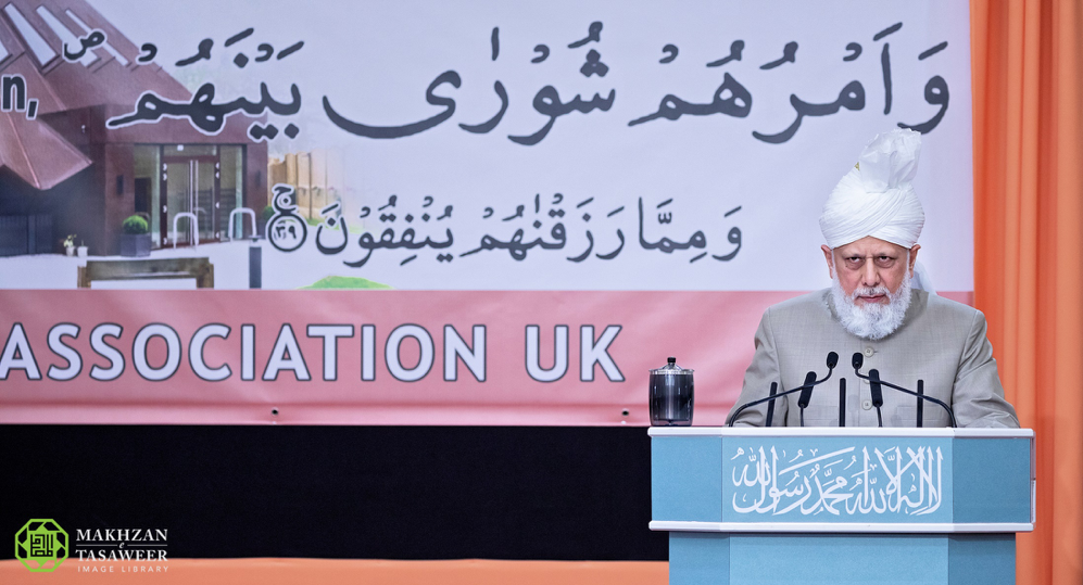إمام الجماعة الإسلامية الأحمدية العالمية يخطب في مجلس الشورى الذي عقدته الجماعة الإسلامية الأحمدية في المملكة المتحدة