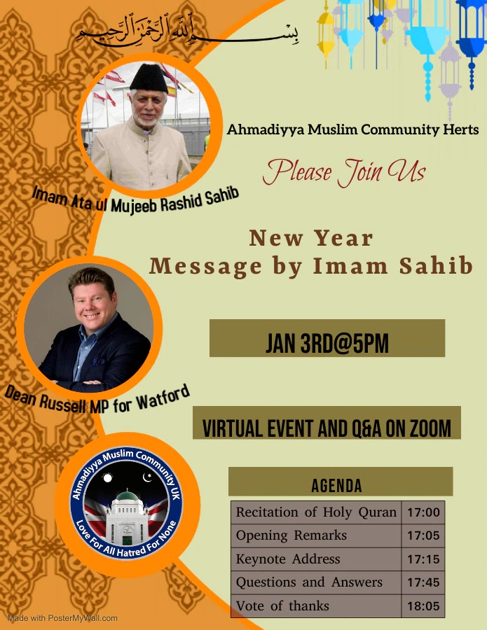 قامت الجماعة الإسلامية الأحمدية في هارتفوردشير، المملكة المتحدة بتنظيم برنامج خاص بعنوان ’’رسالة الإمام بمناسبة رأس السنة‘‘ في 3 يناير / كانون الثاني 2021م، ويعتبر هذا البرنامج أول برنامج يتم تنظيمه على مستوى المقاطعة.
