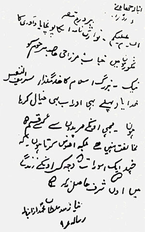 "وكذلك سدروا في غلوائهم، وجمحوا في جهالاتهم، وسدلوا أثواب الخيلاء يوما فيوما، حتى بدا لهم أن يشيعوا خزعبلاتِهم ويصطادوا السفهاء بتلبيساتهم، فكتبوا كتابا فيه سبُّ رسول الإسلام صلى الله عليه وسلم، وسبُّ كلام الله تعالى، وإنكارُ وجود البارئ عز اسمه." (المرجع السابق 567) هذه الوثيقة التي نشرها بعض المنشقّين عن الإسلام في الأسرة.. وجدت ذيوعًا في الصحافة النصرانية. (جريدة "جشمه نور، أمرتسار، بتاريخ 13/8/1885م) وطلب كاتبوها من المؤمنين بدين الإسلام أن يأتوا بآية تثبت صدق عقيدتهم.