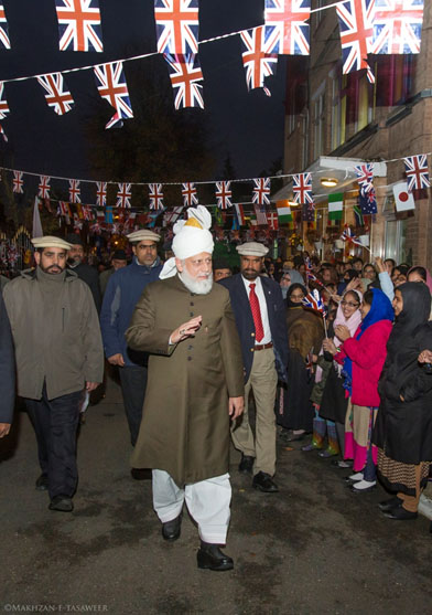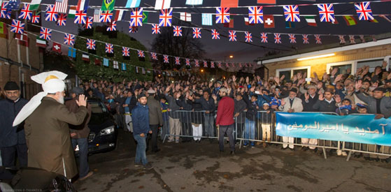 وكان في استقباله نصره الله حشد من مئات المسلمين الأحمدين الذين تجمعوا للترحيب بحضرته في مسجد الفضل.