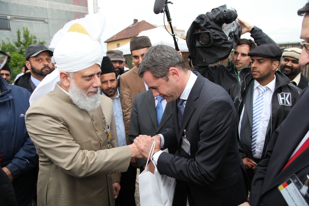 ولدى وصول أمير المؤمنين أيده الله تعالى بنصره العزيز إلى ڤيسبادن، كان في استقبال حضرته عمدة المدينة سفين خيريتش.