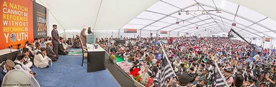 ثم تحدث حضرته بعمق عن دعوة مؤسس الجماعة الإسلامية الأحمدية حضرة ميرزا غلام أحمد القادياني، وذكر كيف أن أناسًا من أجزاء مختلفة من العالم قد اهتدوا إلى حقيقة الأحمدية من خلال التوجيه الإلهي عبر الرؤى، وقال إنه كل عام ينضم مئات الآلاف من الناس إلى الجماعة الإسلامية الأحمدية والتي تأسست اليوم في أكثر من مائتي بلد.