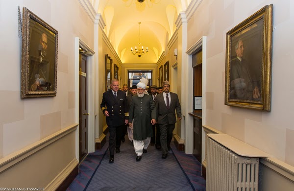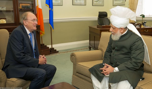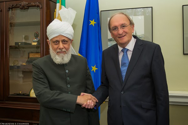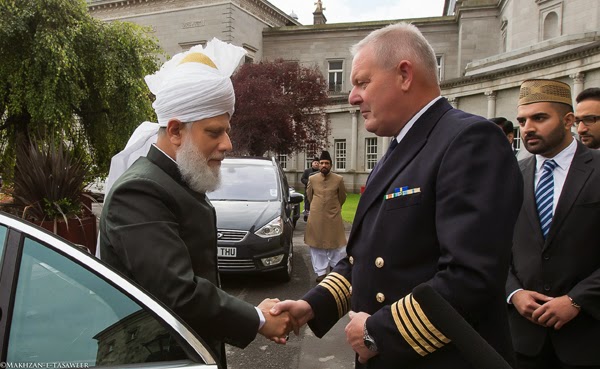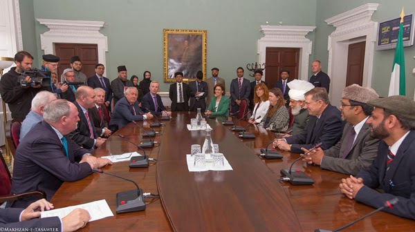 زار يوم 24 /09/ 2014، إمام الجماعة الإسلامية الأحمدية العالمية الخليفة الخامس حضرة ميرزا مسرور أحمد البرلمان الوطني الإيرلندي "التشريعي" في لينستر هاوس في دبلن.