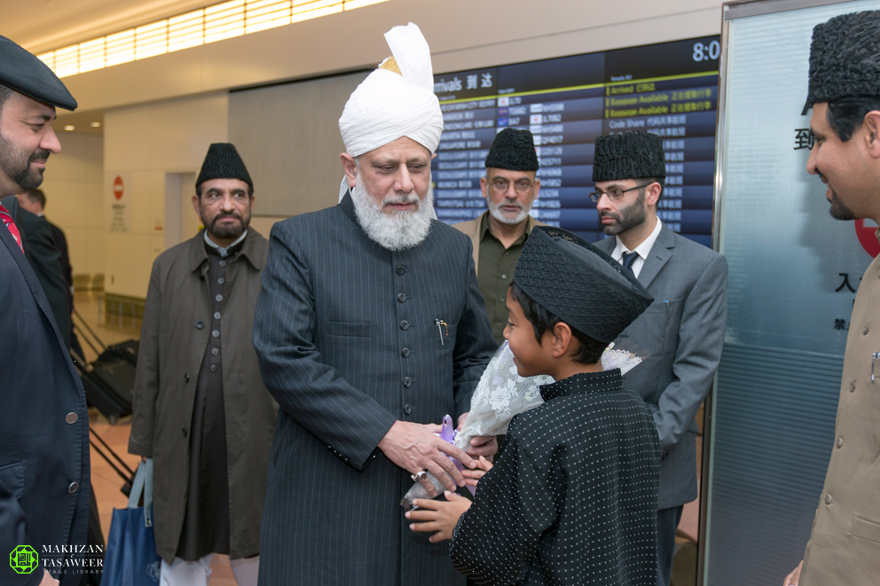 وقد وصل حضرته إلى مطار طوكيو هانيدا عند الساعة 7:40 صباحًا حيث كان في استقباله السيد أنيس أحمد نديم رئيس الجماعة الإسلامية الأحمدية في اليابان وعدد من أبناء الجماعة من اليابان وخارجها.