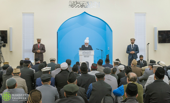ثم ألقى حضرة الخليفة خطبة الجمعة من المسجد الجديد حيث أوجز خلالها الأهداف الحقيقية والسلمية للمساجد.