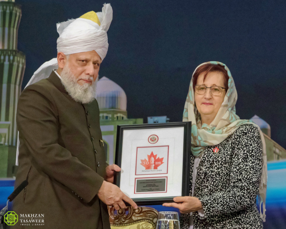 وقدمت عضوة مجلس المدينة، مارلين لافريت هدية لحضرة الخليفة بمناسبة الذكرى الــ50 لتأسيس الجماعة الإسلامية الأحمدية في كندا، وقالت: