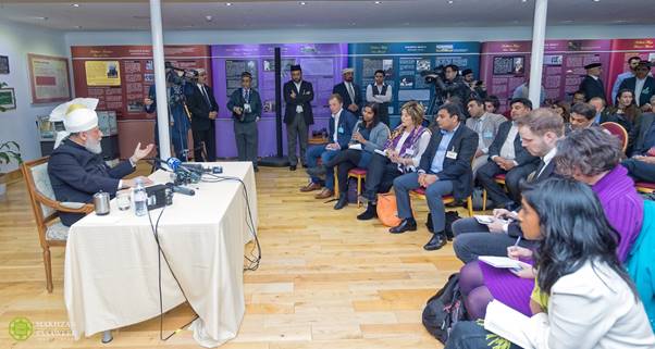وقال حضرته إنه على الرغم من أن تعاليم الإسلام قاطعة في رفض الهجمات أو عمليات القتل العشوائية، فإن العديد من الناس قد ربطوا الإسلام بالعنف أو الحرب.