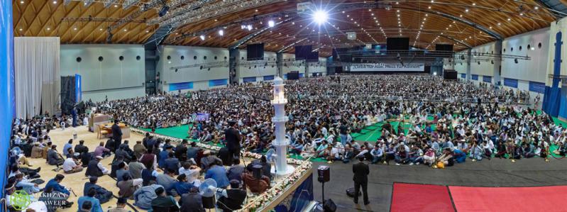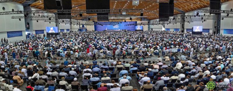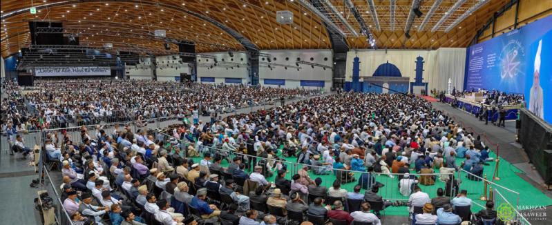 وخلال كلمته، تحدث حضرته عن استمرار تحقق نبوءات مؤسس الجماعة الإسلامية الأحمدية، حضرة ميرزا غلام أحمد القادياني (عليه الصلاة والسلام) فيما يتعلق بانتشار الأحمدية -الإسلام الحقيقي-.