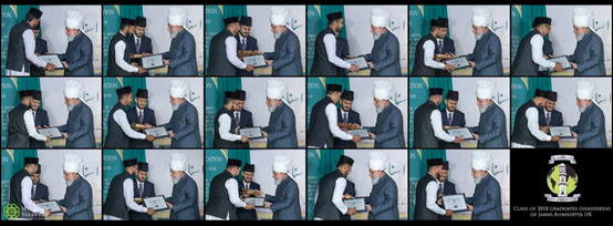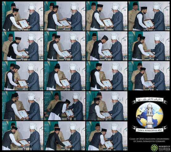 وخلال حفل التخرج، تم منح 17 خريجا من الجامعة الأحمدية في المملكة المتحدة و6 خريجين من الجامعة الأحمدية في كندا و18 خريجًا من الجامعة الأحمدية في ألمانيا "درجة شاهد" حيث قام حضرة ميرزا مسرور أحمد بتسليمهم شهادات التخرج ليلحقوا بالتالي بركب دعاة وأئمة الجماعة الإسلامية الأحمدية.