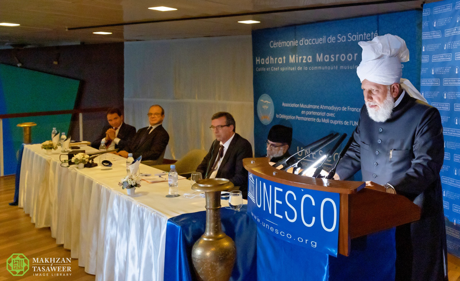 ألقى إمام الجماعة الإسلامية الأحمدية العالمية حضرة ميرزا مسرور أحمد خليفة المسيح الخامس خطابًا تاريخيًا يوم 08/10/2019 في مقر الأمم المتحدة للثقافة والعلوم (اليونيسكو) في باريس.