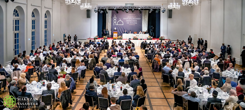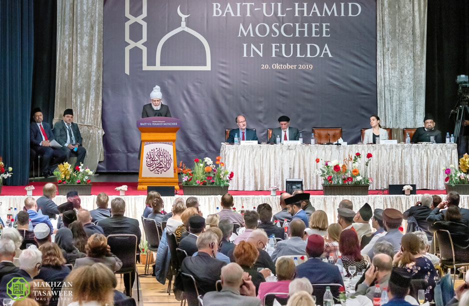 في بداية خطابه، عبر حضرته عن امتنانه لأهل مدينة فولدا الذين ساعدوا في مشروع المسجد.