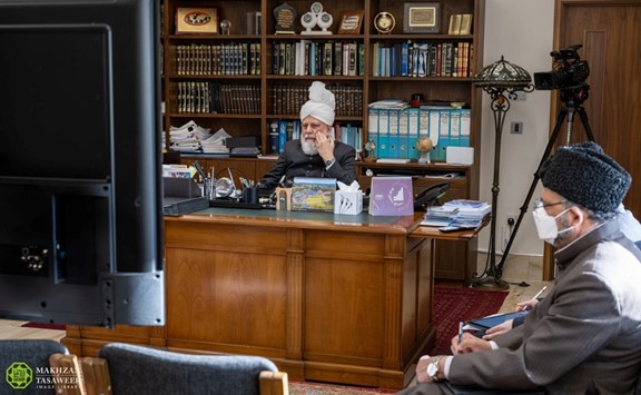 في 07/11/2020، تشرفت الهيئة الإدارية الوطنية للجماعة الإسلامية الأحمدية في سويسرا بلقاءٍ افتراضي مع إمام الجماعة الإسلامية الأحمدية العالمية، خليفة المسيح الخامس حضرة ميرزا مسرور أحمد.