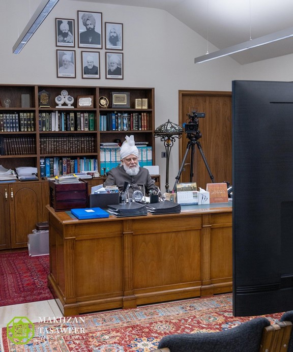 ترأس حضرته الاجتماع من مكتبه في إسلام أباد في تيلفورد، فيما انضم أعضاء الهيئة الإدارية الوطنية إلى الاجتماع الافتراضي من قاعة معرض القرآن الكريم في قاديان، الهند.