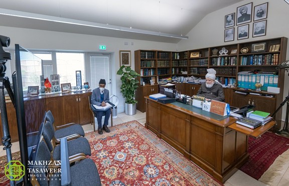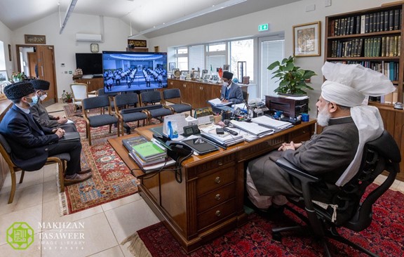 ترأس حضرته الاجتماع الافتراضي من مكتبه في إسلام أباد في تيلفورد، بينما اجتمع 77 عضوًا من مجلس أطفال الأحمدية في مسجد دار الأمان في مانشستر.