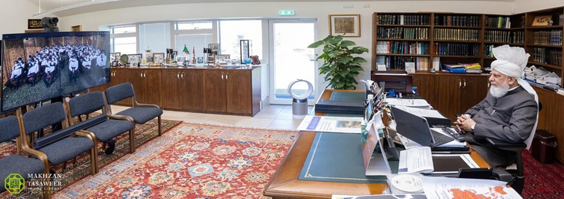 ترأس حضرته الاجتماع من مكتبه في إسلام أباد في تيلفورد، بينما انضم أعضاء مجلس أطفال الأحمدية عبر الإنترنت من بانجول، المقر الوطني للجماعة الإسلامية الأحمدية في غامبيا.