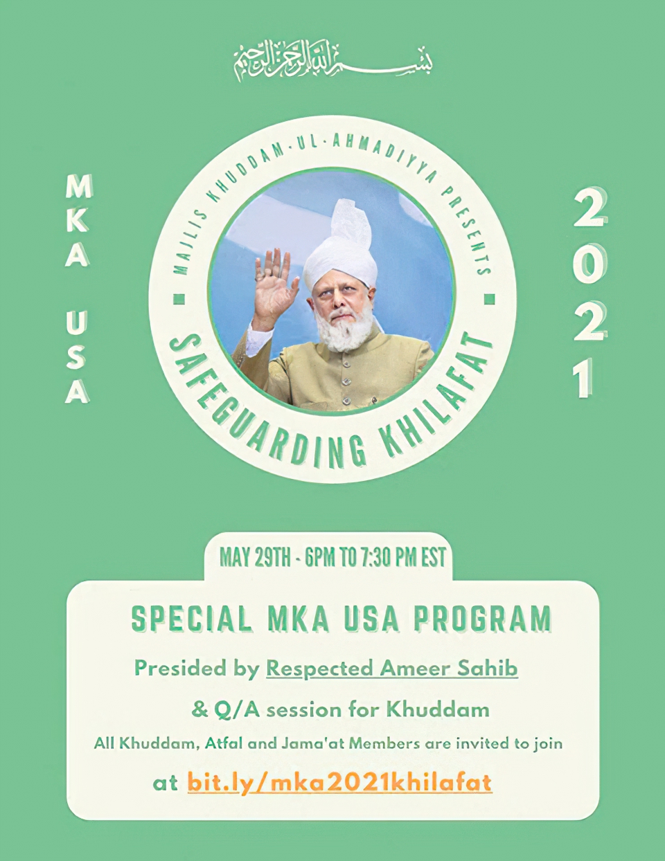 تم بفضل الله تعالى انعقاد برنامج بعنوان الحفاظ على الخلافة الأحمدية تحت إشراف مجلس خدام الأحمدية في الولايات المتحدة في 29 مايو / أيار 2021م.