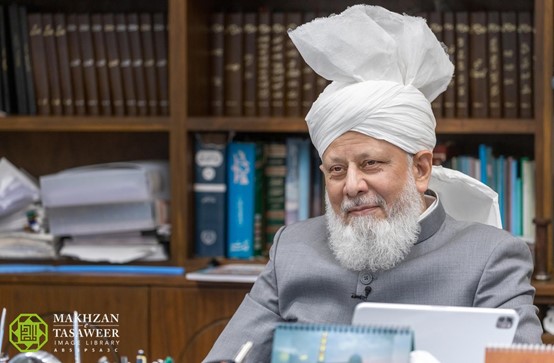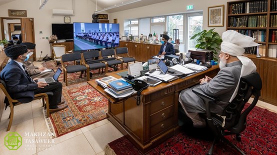 ترأس حضرته الاجتماع الافتراضي من مكتبه في إسلام أباد في تيلفورد بينما حضر الطلاب من مسجد بيت الفتوح في لندن.
