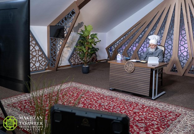 ترأس حضرته الاجتماع الافتراضي من مكتبه في إسلام أباد، في تيلفورد بينما تجمع الطلاب في قاعة اللجنة في أجوكوروا في لاغوس، نيجيريا.