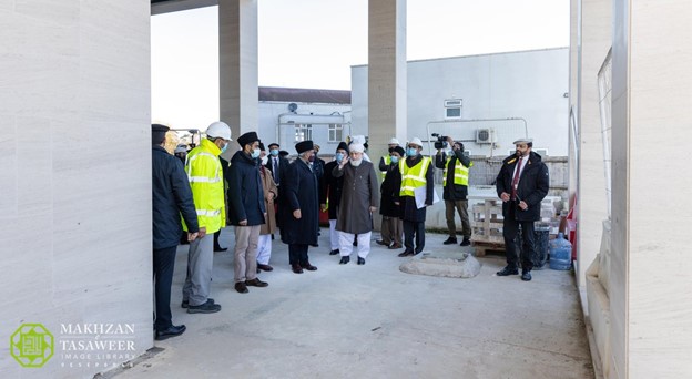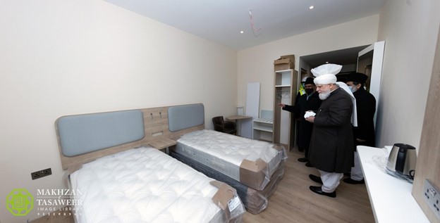 قام حضرة الخليفة بجولة في المجمع المكون من 5 طوابق والذي يضم قاعتي مناسبات ومكاتب ومرافق إقامة للضيوف والتي تشمل 12 غرفة نوم خاصة وصالات نوم مشتركة أخرى.