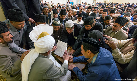 وبعد خطبة الجمعة بايع أحمديون جدد على يد خليفة المسيح الموعود نصره الله.